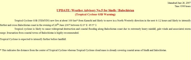 The Indian Meteorological Department (IMD) showed a careless attitude towards Pakistan in 2007, even though the two countries had good relations in 2007. However, this is unacceptable that IMD’s cyclone warning website was offline throughout the critical period. Was there a load-shedding going in the future super power capital New Delhi?, they forecasted that landfall of this “depression” was still 12 hours away while the weak “category-1 hurricane Yemyin” was one hour from making a landfall and also the IMD showed a wrong track of this storm in 2007. If the IMD can not provide warning to its neighbours than it should resign from the post of Regional head as that is their job to do so.