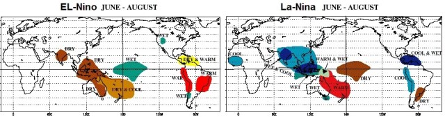 La Nina would bring cool to wet conditions over southern Africa, Australia, and Brazil during the southern hemisphere summer.