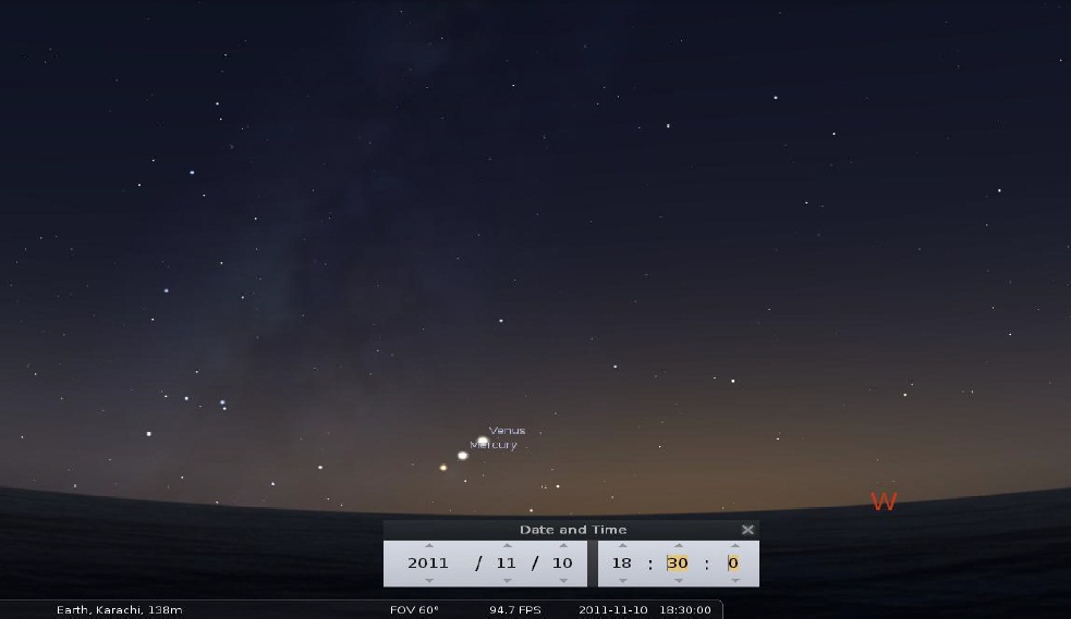 This astronomical event could have been visible just above the horizon in a westward direction of the sky between 5:45 pm PKT till 6:30 pm PKT . The main feature of this event was that Venus, Mercury and Antares could have been viewed in a straight line together during the early hours of evening.