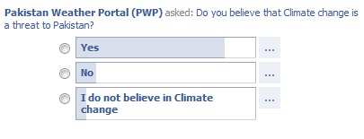 Pakistan Weather Portal (PWP) conducted a poll on December 27 and majority of the people believed that climate change is a threat to Pakistan. It was surprising to observe this because in the middle of 2011 a local newspaper published a poll that showed the most Pakistani do not believe that climate change is a threat to the country.