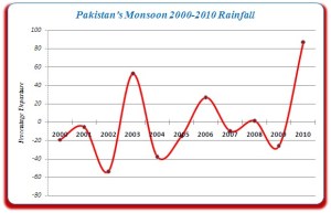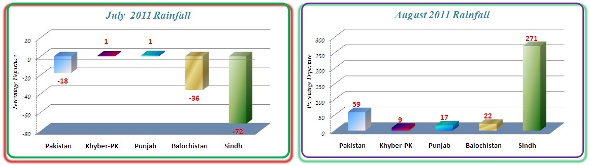 Monsoon season in Sindh generally starts in the from July till late August but during the monsoon season of 2011, precipitation started from late July and continued till mid-September. In 2010, the monsoon rainfall were 87% above normal in Pakistan and was highest since 1994 and ranked second highest during last 50 years of period. In 2011, the monsoon rainfall in Sindh was alone 270% above normal, which were the heaviest recorded during the period 1961-2011.