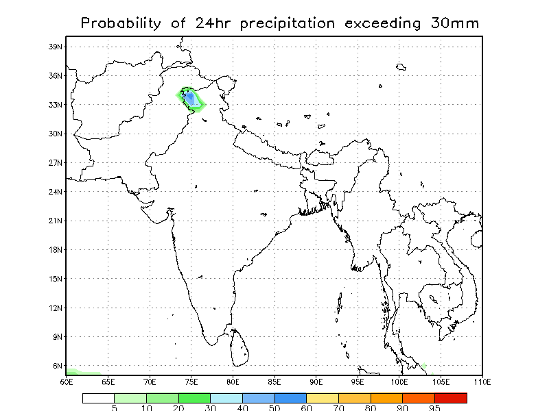 Rainfall is also expected in Islamabad and Peshawar from February 11 mid-night till Febrary 13 night/February 14  morning with intervals as by then WD 20 would start to move away from Pakistan, while there are also chances of isolated shower in Lahore and Multan during the period. There are slight chances of drizzle/shower in Karachi, Sukkur, Nawabshah and Hyderabad on February 12 night till February 13 morning. (The picture on right shows where rainfall will exceed 30 mm on February 13).