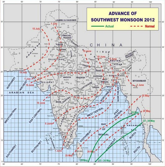 Pakistan Weather Portal (PWP) had forecasted on April 4 that monsoon 2012 would be near normal to below normal as a whole over the sub-continent but isolated places might experience some above normal rainfall that includes West Bengal, Jharkhand, Assam, Utter Pradesh, Madya Pradesh and parts of Bangladesh. It is likely that monsoon rainfalls may develop rapidly during the onset of the season but as summer progresses further a decrease in the overall coverage of rainfall could occur. August and September, are the two months in which decrease in the rainfall activity is expected.
