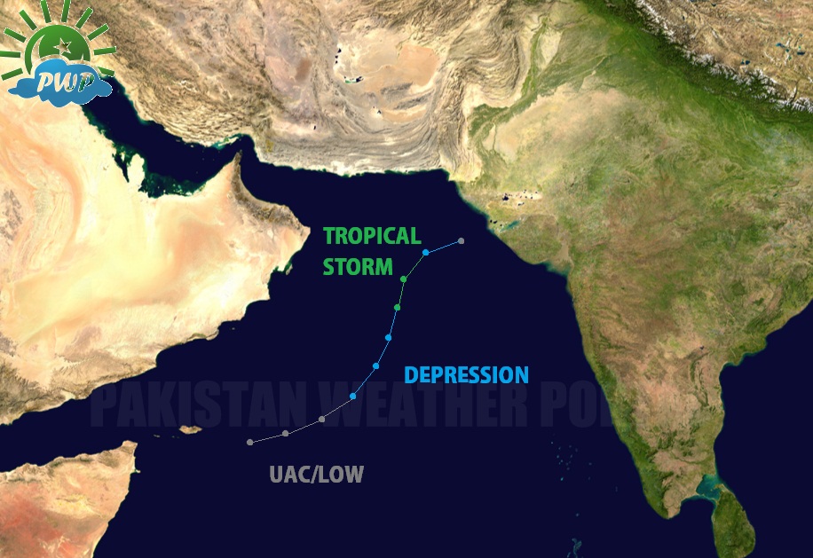 There are chances that after 72 hours a low pressure area may form in the south-west Arabian sea that would eventually move in a north-north-eastward direction and it may intensify into a tropical depression (25%). As of May 29 at 10:11 pm PKT, the same model indicates a slightly different track that the depression will intensify into a tropical storm (5%) and move in a ENE direction before rapidly weakening and dissipating near the Indian coast of Gujarat.