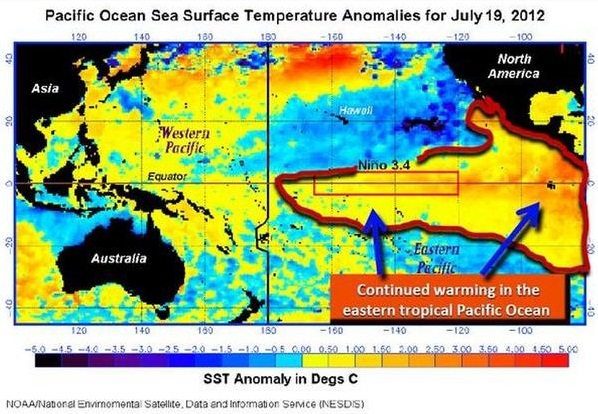 The provided map shows that the greatest warming has occurred near the west coasts of Central and South America where sea surface temperature (SST) has risen to by 2.0°C which is above the normal average of this part of the world in July which is a clear indication that El-Nino is happening.