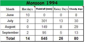 But apart from all years 1994 was an ‘exceptional’ or a very very special Monsoon season in Karachi, the wettest and the most memorable in my life. At the start of that season it was quite humid i.e in the last week of June and first shower with winds occurred on 30th June evening where first proper rain hit on 2nd July. City continued to receive good rains caused by systems mostly coming from the Bay of Bengal to Sindh till 17th July including days like July 4, 5, 10, 16 & 17 with heavy falls. After that it remained mostly cloudy with drizzle at times till July 31.