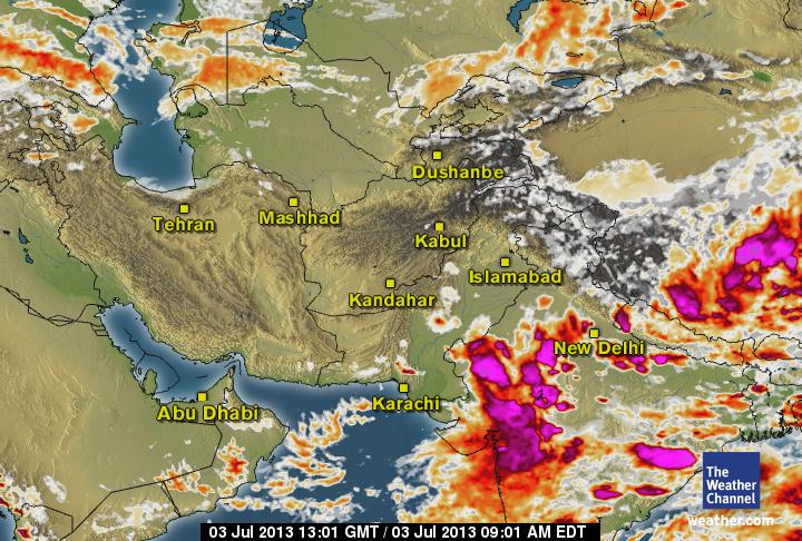 Thundercloud that formed over Awaran district of Balochistan is dissipating over Panjgur. Thunderstorm dissipating over Punjab, another dissipating over north-eastern Balochistan. Fresh thundercloud forming over upper Khyber Pakhtunkhwa under that influence rain with thunder/lightning can occur in Islamabad, NE and north Punjab (Lahore, Sialkot, Gujranwala, Faisalabad, Sheikhpura, Rawalpindi (including Murree city), Jhelum, Gujarat, Mandi Bahauddin and few adjoining areas), parts of Khyber Pakhtunkhwa (Hangu, Kohat, Khyber Agency, Khurram Agency, Abbottabad, Manshera, Haripur, Swabi, Swat and few adjoining districts) and Azad Kashmir (Muzaffarabad, Kotli, Mirpur and few adjoining areas). Rain at times heavy (isolated very heavy in few areas) can occur in north-eastern and northern areas of Punjab from July 7 night/July 8.