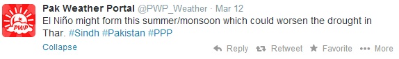 NOAA, Australian and Japanese Meteorological Agencies have issued El-Nino watch for the Pacific Ocean. Pak Government should gear up for any uncertain situation as deficient monsoon rain may worsen the persisting drought in Thar, leading to severe drought conditions extending upto south Punjab and adjoining Balochistan. El Nino (the boy) refers to the warming of the Pacific Ocean which usually causes the collapse of monsoon in the Indian sub-continent.