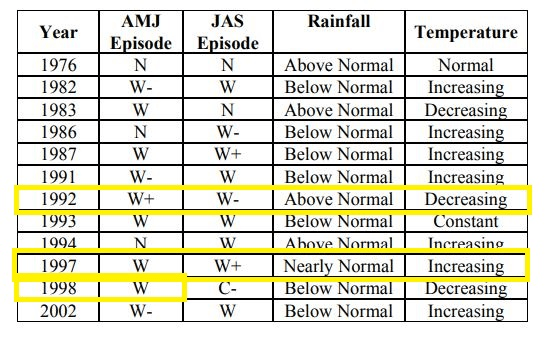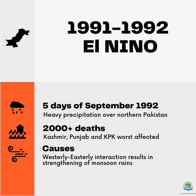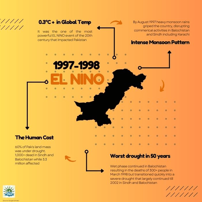 The 1997-1998 El Nino event had a mixed impact on Pakistan. While 1997 mainly saw nearly normal to slightly above normal monsoon rains that resulted in floods, the latter half of the year mainly post-1998 Q2 was marked by drought conditions.