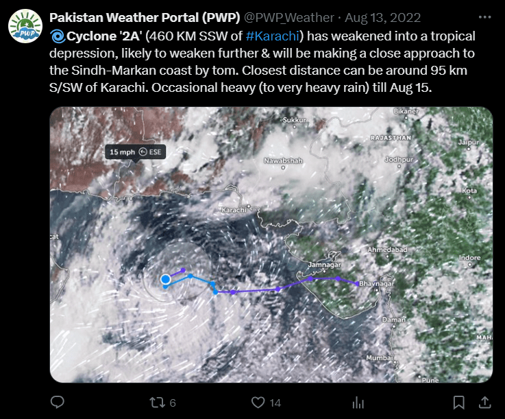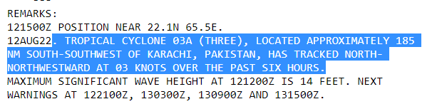 If we categorize storms based on the SSHWS scale, a cyclone occurred recently in the Arabian Sea in August (as shown in the above picture). According to the JTWC, a cyclone formed in early August in 2022 approximately south-southwest of Karachi and was designated as 03A, see below.